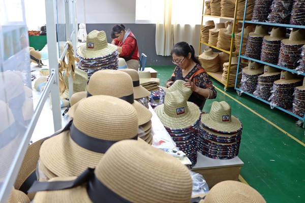 2024年11月9日,浙江温岭一工艺美术品股份有限公司生产车间内,工人们忙着给发往欧美国家的草编帽进行半成品定型、添花、修边等作业。 IC photo