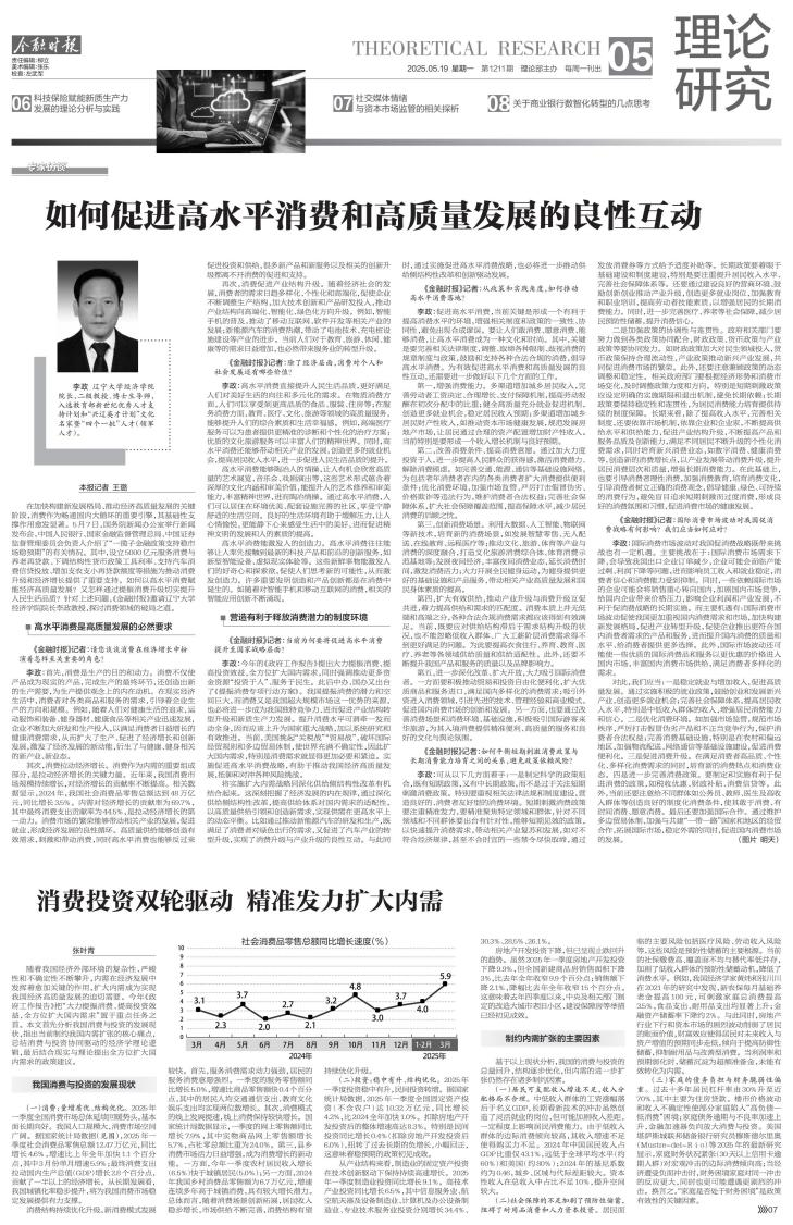 在加快构建新发展格局、推动经济高质量发展的关键阶段,消费作为畅通国内大循环的重要引擎,其基础性支撑作用愈发显著。5月7日,国务院新闻办公室举行新闻发布会,中国人民银行、国家金融监督管理总局、中国证券监督管理委员会负责人介绍了“一揽子金融政策支持稳市场稳预期”的有关情况。其中,设立5000亿元服务消费与养老再贷款、下调结构性货币政策工具利率、支持汽车消费信贷投放、增加支农支小再贷款额度等措施为推动消费升级和经济增长提供了重要支持。如何以高水平消费赋能经济高质量发展?又怎样通过提振消费升级切实提升人民生活品质?针对上述问题,《金融时报》邀请国产一区二区日本在线经济学院院长李政教授,探讨消费领域的破局之道。